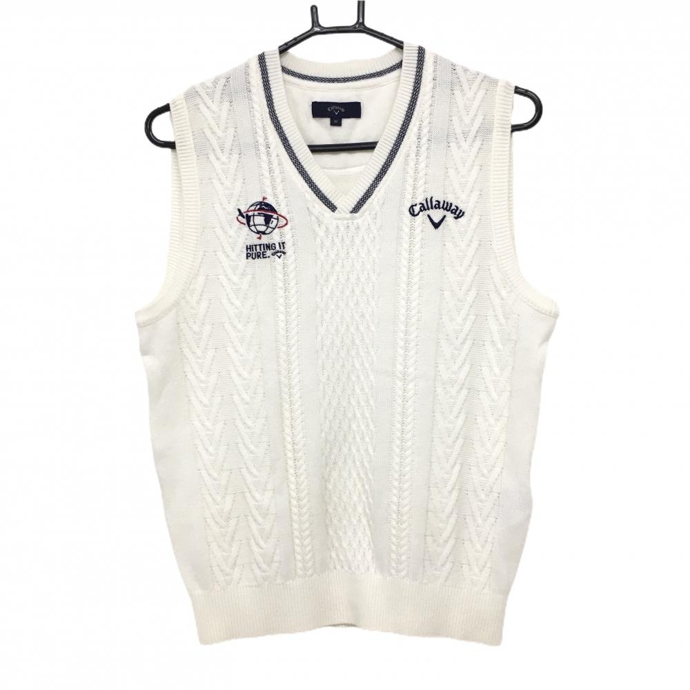 【超美品】キャロウェイ ニットベスト 白 ケーブル編み ロゴ黒 Vネック メンズ L ゴルフウェア Callaway