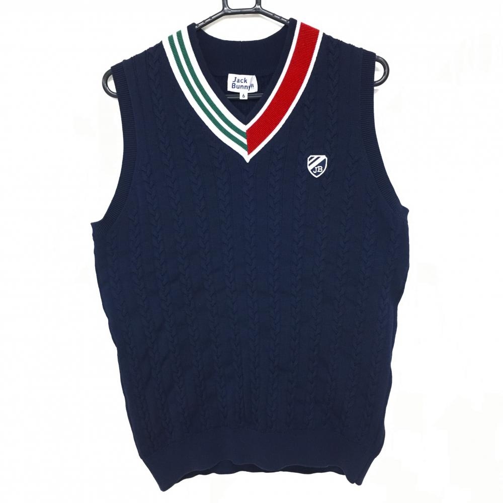 【超美品】ジャックバニー ニットベスト ブラウン×ネイビー フロントライン Vネック ワッペン メンズ 5(L) ゴルフウェア Jack Bunny