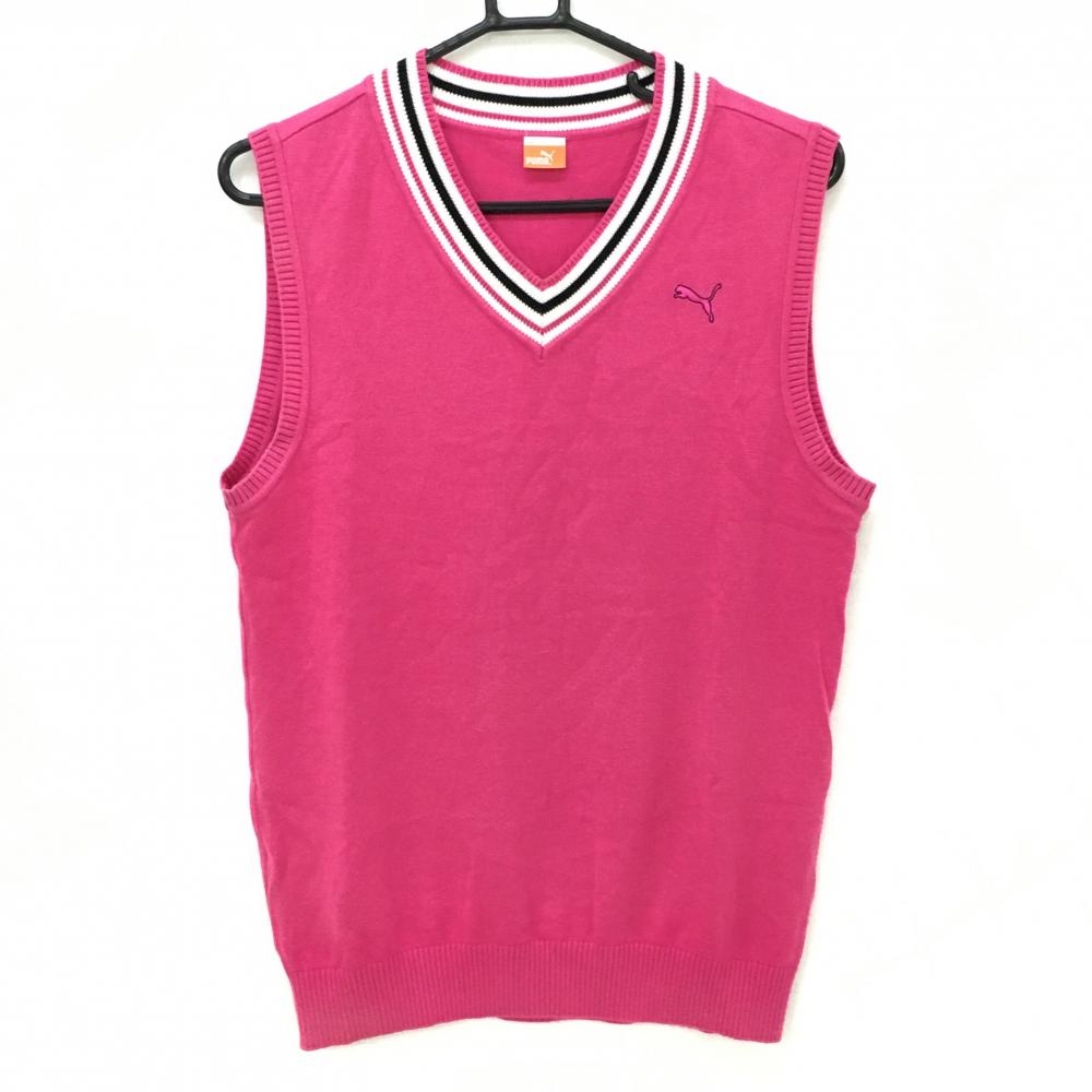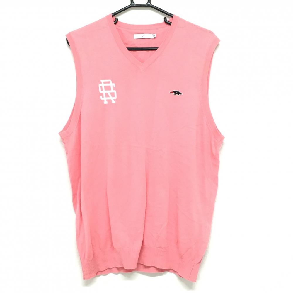 【新品】ラフアンドスウェル ニットベスト ピンク×白 フロント英字 コットン100% メンズ M ゴルフウェア 2023年モデル rough&swell
