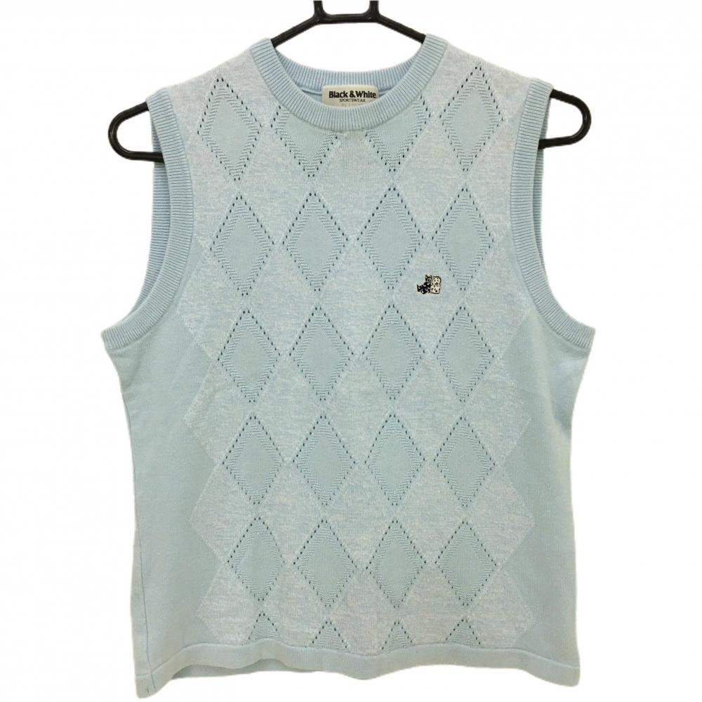 【美品】マンシングウェア ニットベスト ライトブルー×白 フロント英字総柄 ロゴ刺しゅう レディース M ゴルフウェア Munsingwear