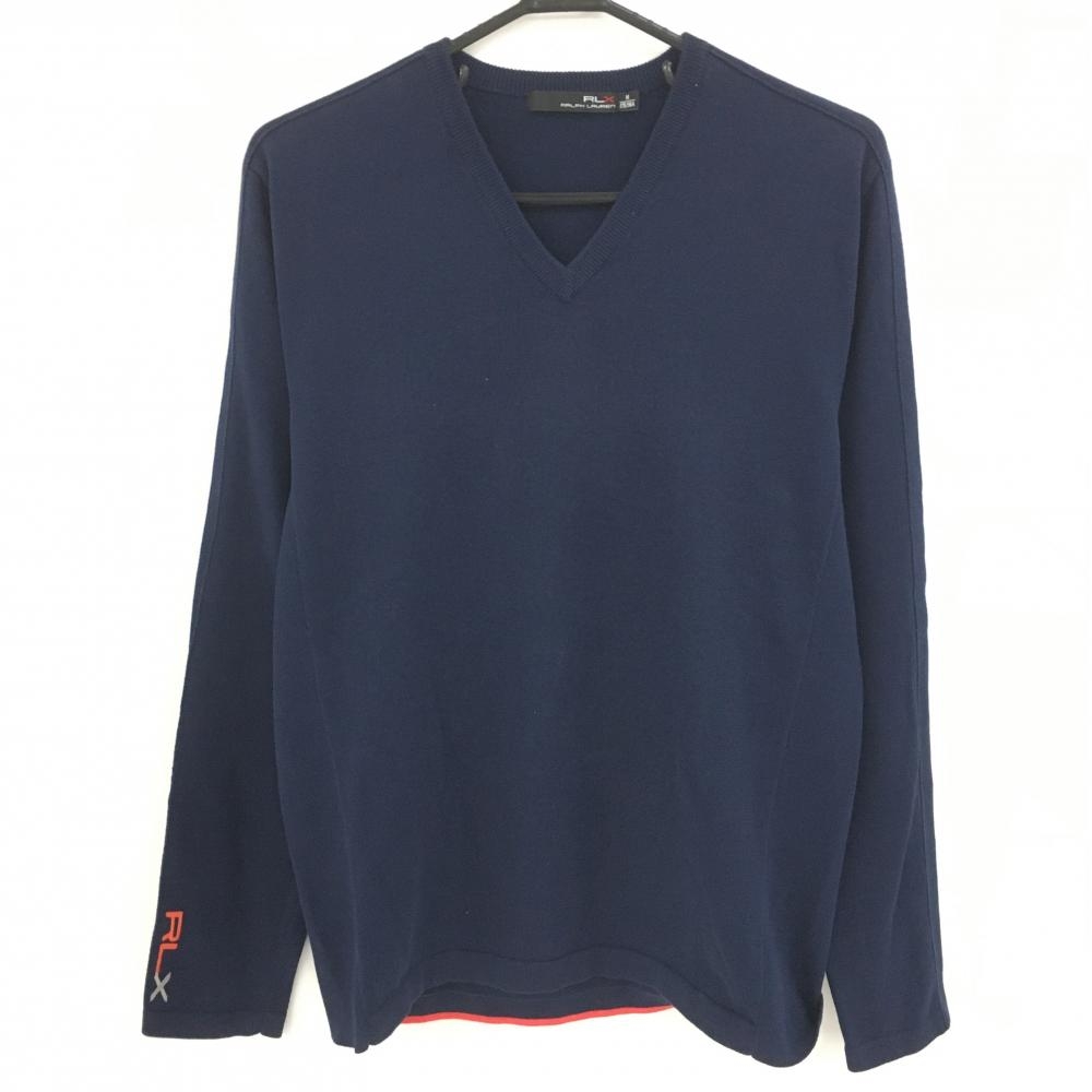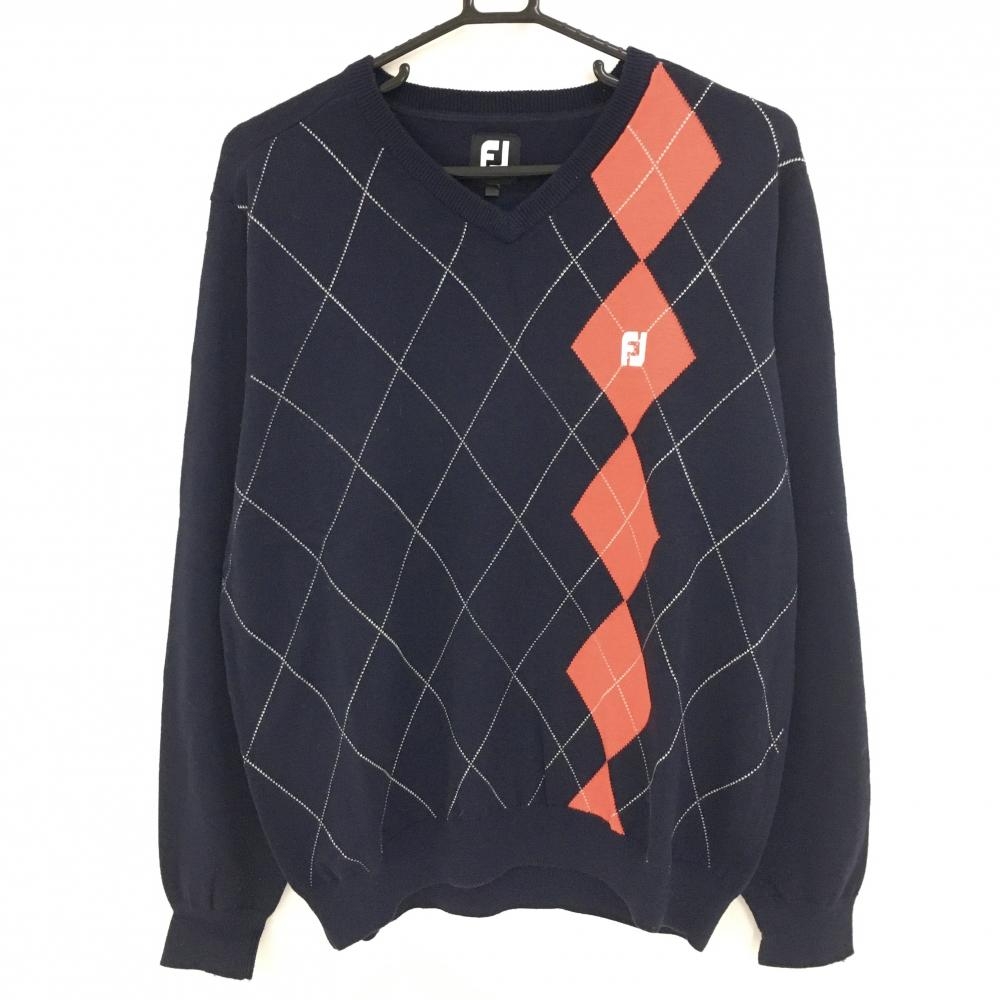 ジェイリンドバーグ セーター ネイビー×レッド ロゴ刺しゅう総柄 Vネック ニット ウール100% メンズ L ゴルフウェア J.LINDEBERG