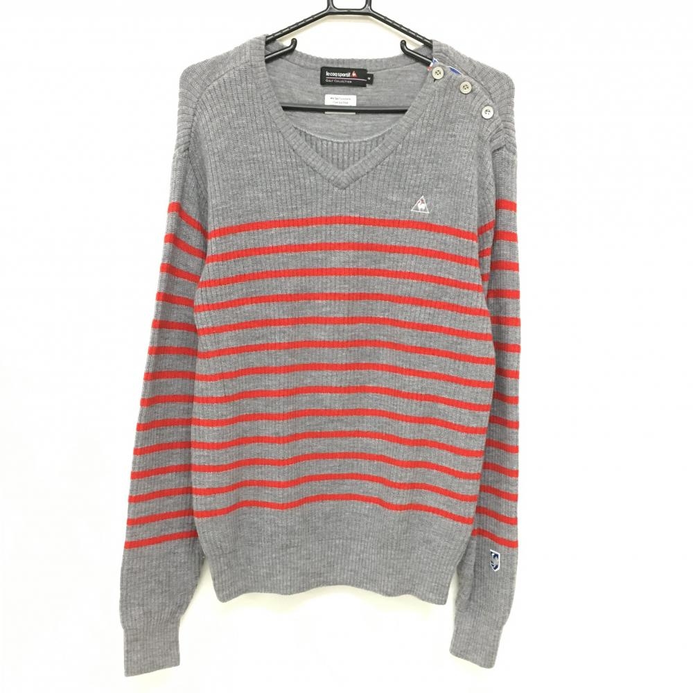 ルコックゴルフ セーター ネイビー×アイボリー ボーダー Vネック 肩ボタン ウール100% ニット メンズ M ゴルフウェア le coq sportif