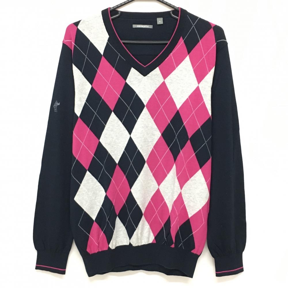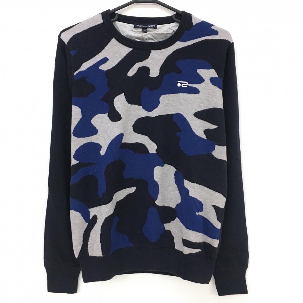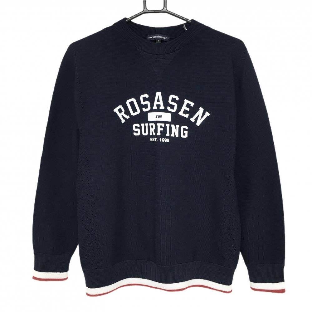 ロサーセン セーター ネイビー×白 袖ダイヤ柄 ロゴワッペン ニット カシミヤ混 レディース M ゴルフウェア Rosasen