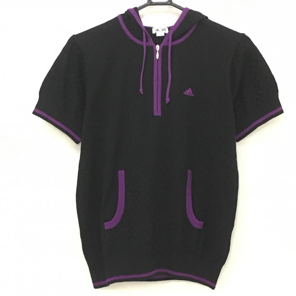 【美品】アディダス 半袖ニットパーカー 黒×グリーン ハーフジップ ボーダー レディース L/G ゴルフウェア adidas