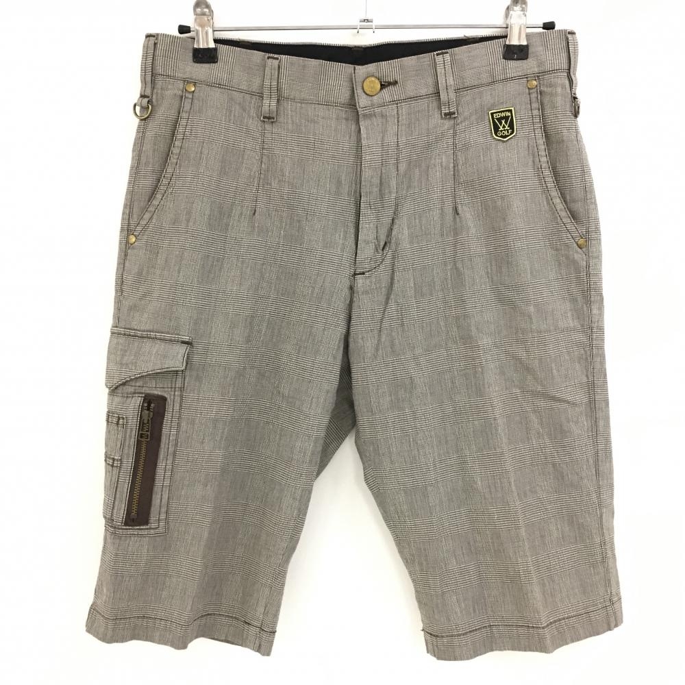 【美品】エドウィンゴルフ ハーフパンツ ブルー×ピンク チェック 麻素材 刺しゅうワッペン メンズ L ゴルフウェア EDWIN GOLF