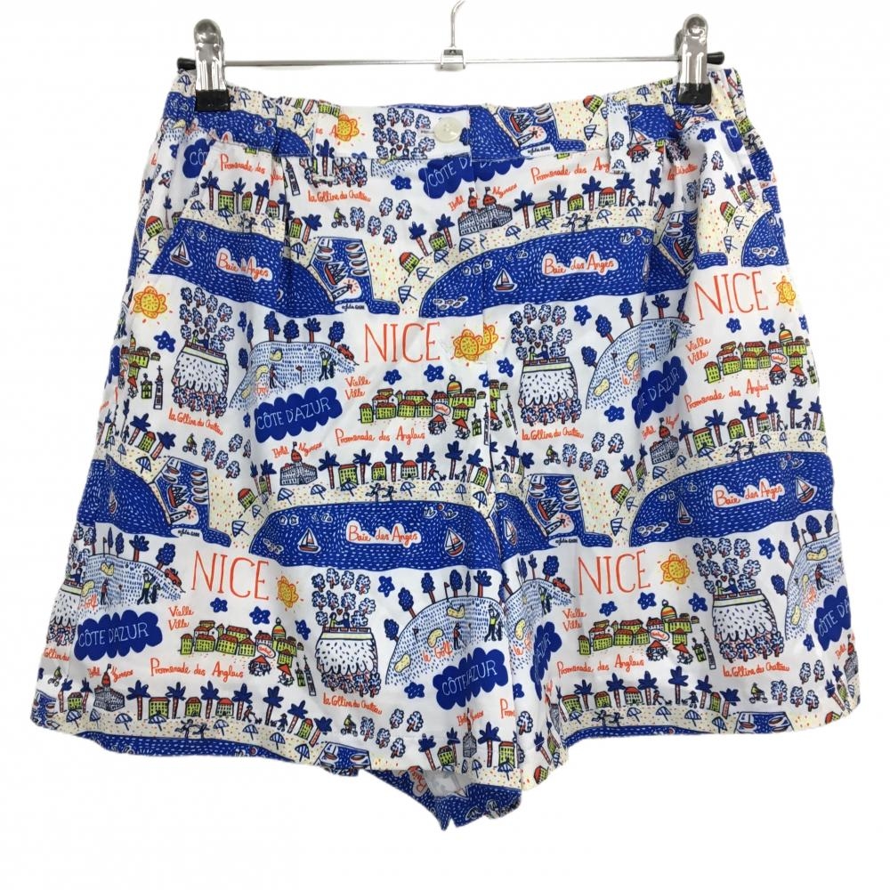 【美品】23区ゴルフ キュロットスカート 白×ネイビー 総柄 乗り物 プリーツ 裏地付 レディース I(M) ゴルフウェア 23区