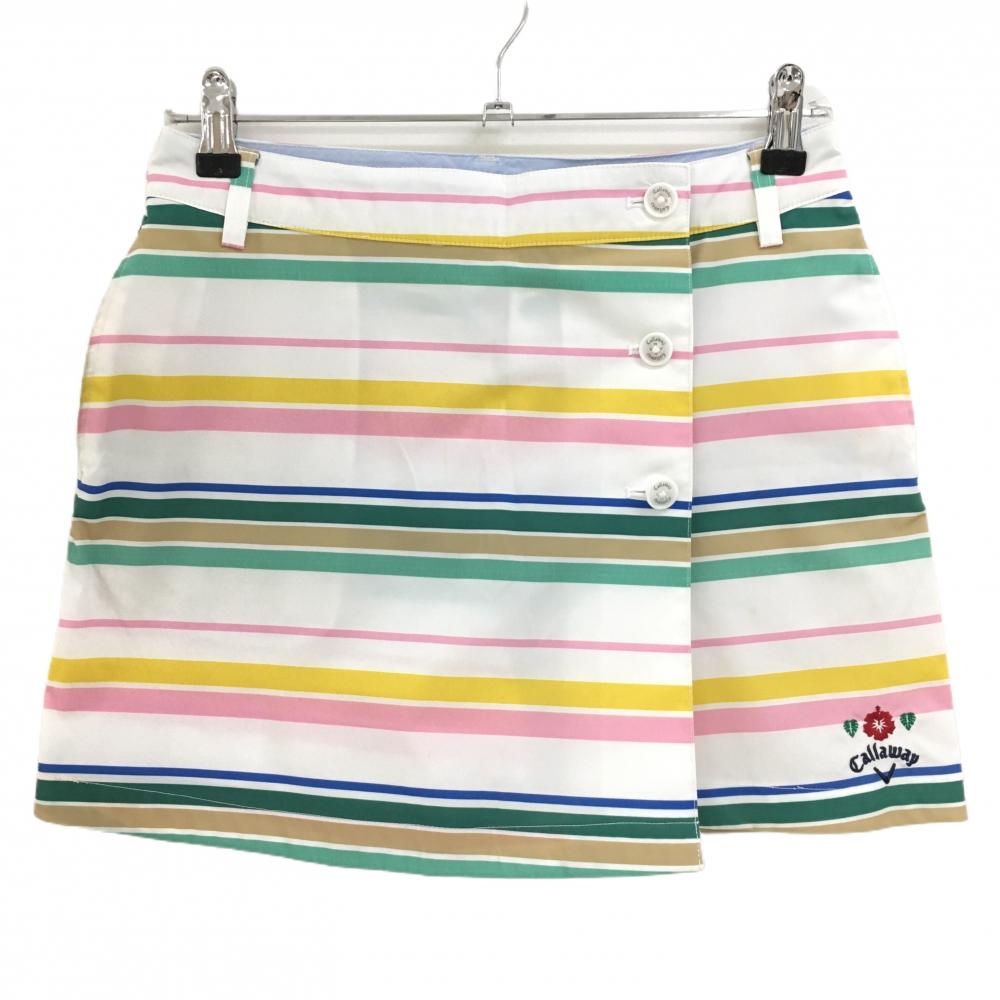 【美品】キャロウェイ キュロットスカート 白×ネイビー ボーダー ハイビスカス刺しゅう レディース L ゴルフウェア Callaway