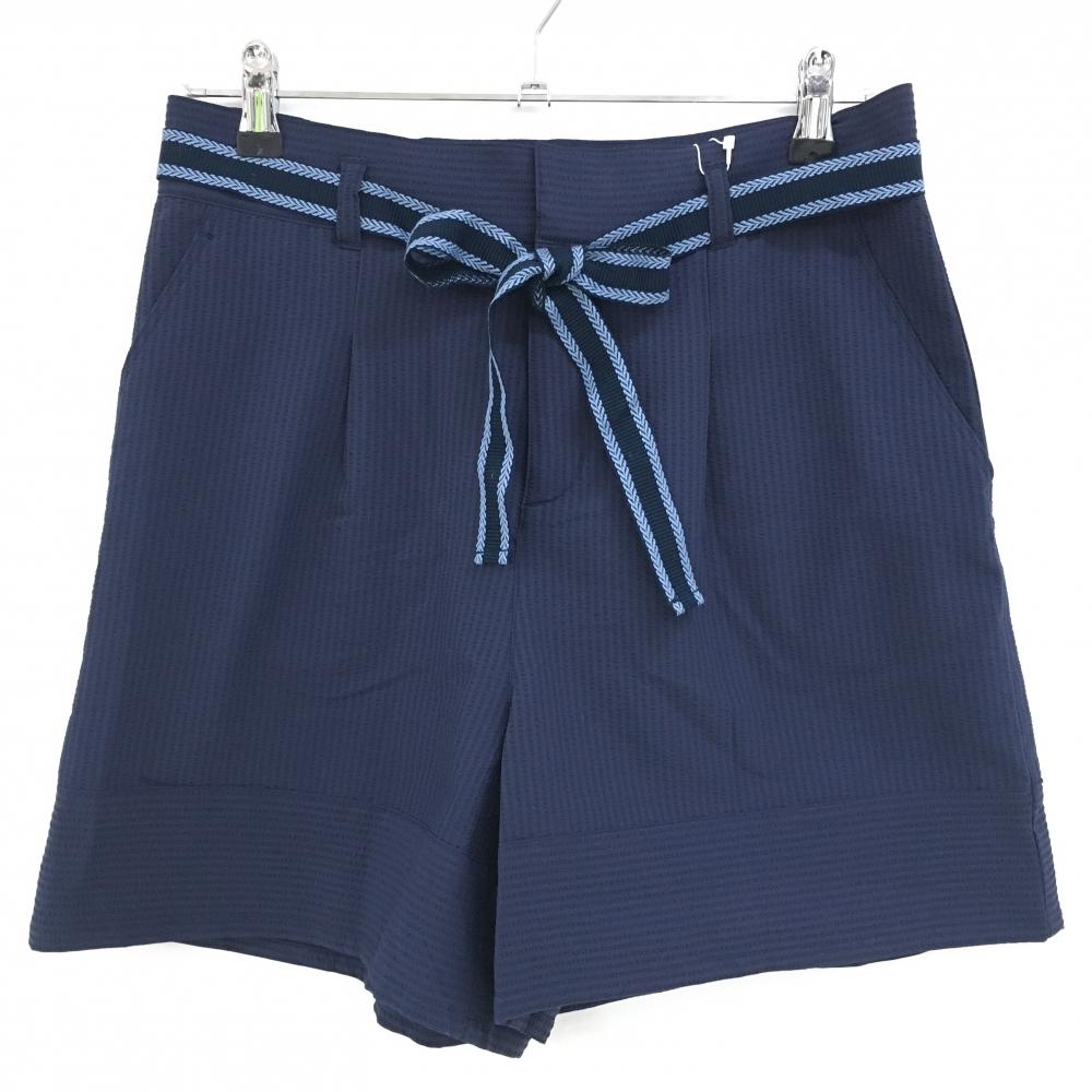 【超美品】キャロウェイ キュロットスカート ネイビー×白 ストライプ柄 ロゴ刺しゅう 布ベルト付 レディース LL ゴルフウェア Callaway