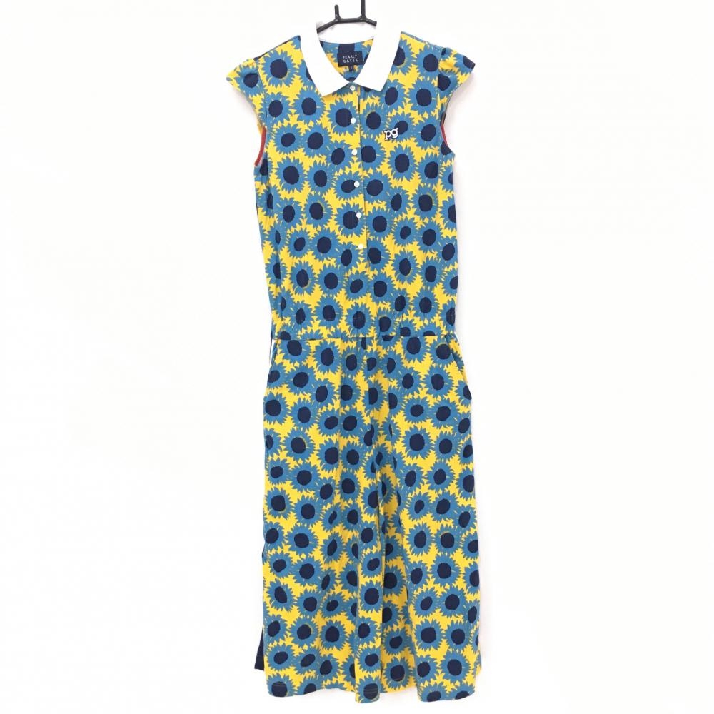 【美品】ブルークラッシュ 半袖ポロワンピース イエロー×グリーン ひまわり総柄 ボーダー レディース M ゴルフウェア BLUE CRUSH