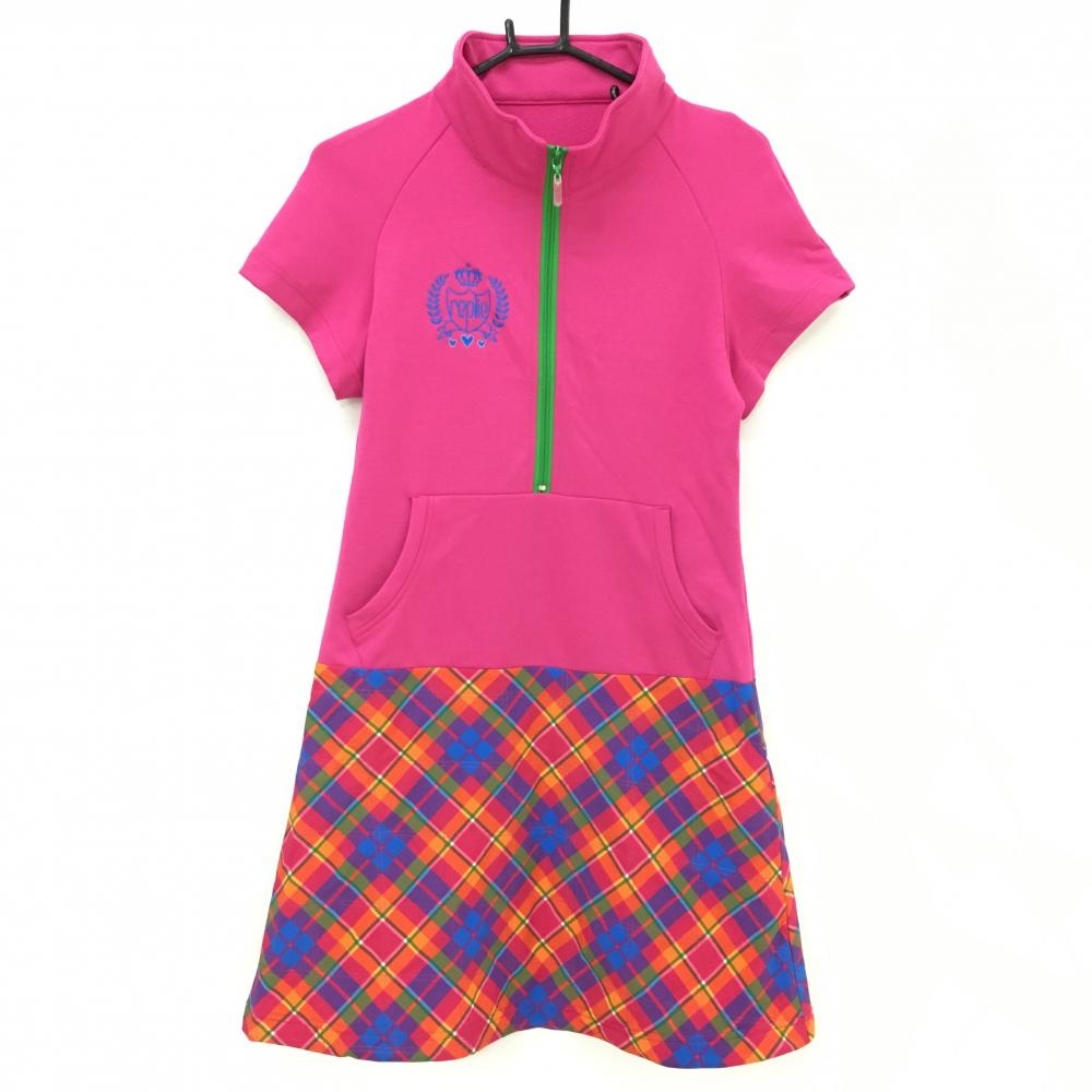 【美品】MUスポーツ 中綿ノースリーブワンピース ピンク×白 ワッペン 薄中綿 レディース 38(S) ゴルフウェア M・U SPORTS