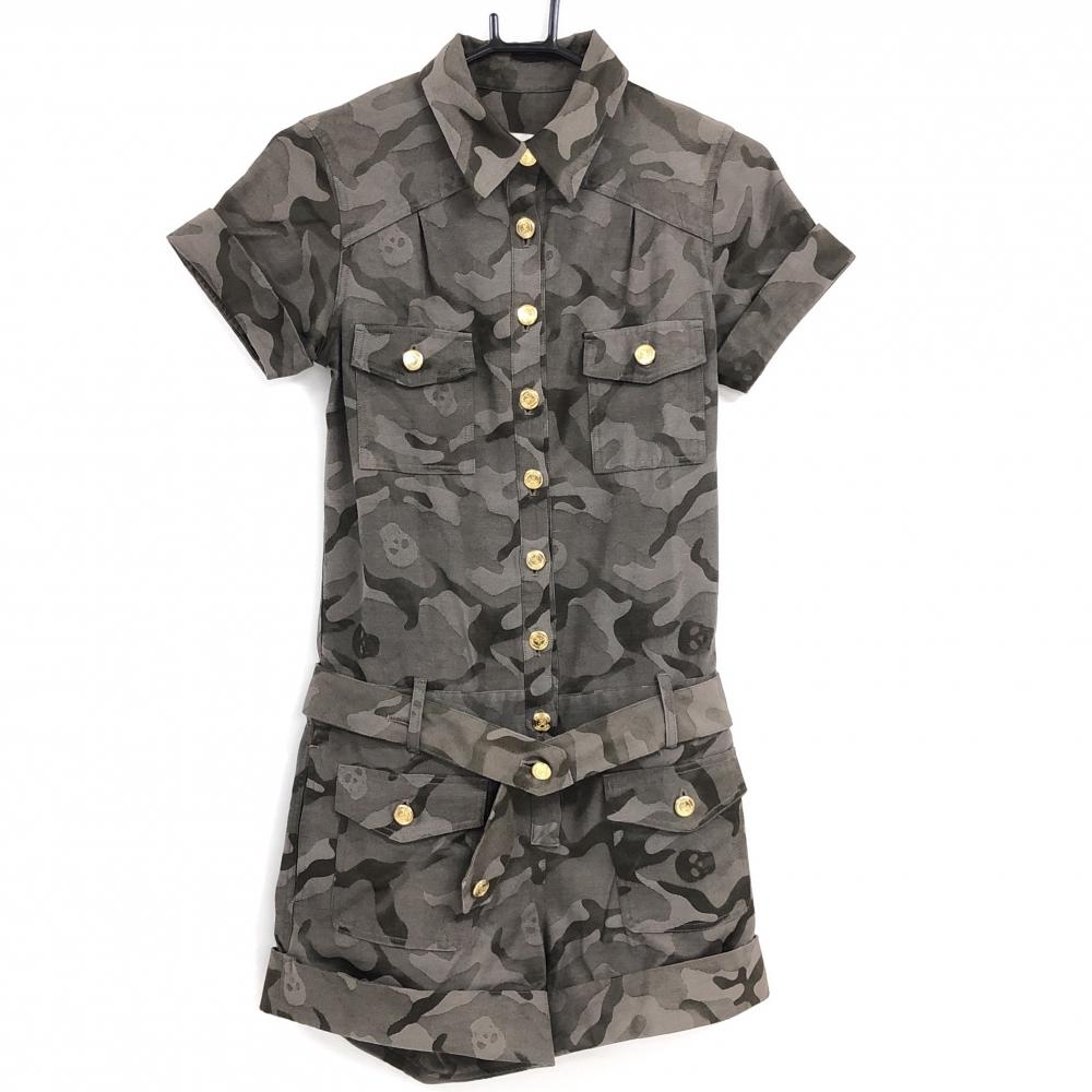 パーリーゲイツ 半袖オールインワン グリーン系×ベージュ×黒 カモフラ 迷彩 スナップボタン レディース 0(S) ゴルフウェア PEARLY GATES