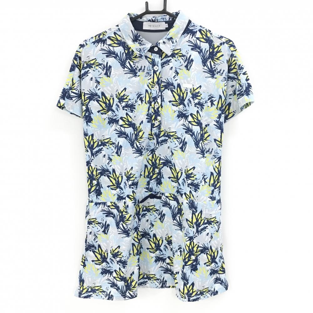 【美品】ヒールクリーク 半袖ハイネックワンピース ライトブルー×イエロー 花柄 ハーフジップ レディース 40(M) ゴルフウェア Heal Creek