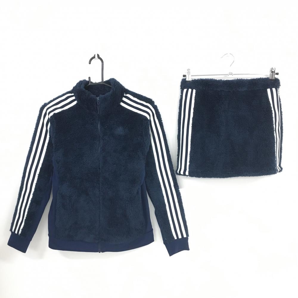 【超美品】アディダス 上下セット(ジャケット×スカート) 黒 ベロア調 ロゴ白 内側インナーパンツ レディース L ゴルフウェア adidas