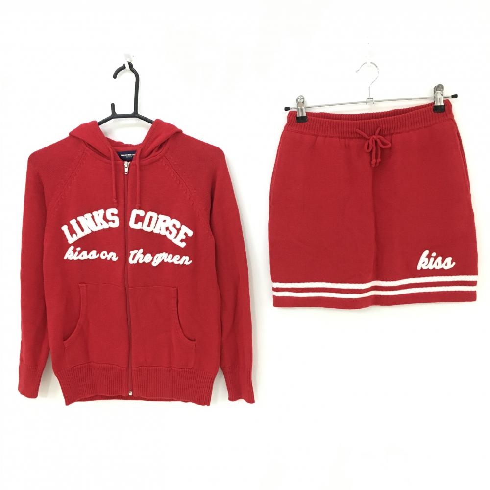 【美品】キスオンザグリーン 上下セット(ニットパーカー×スカート) レッド×白 レディース 2(M) ゴルフウェア kiss on the green
