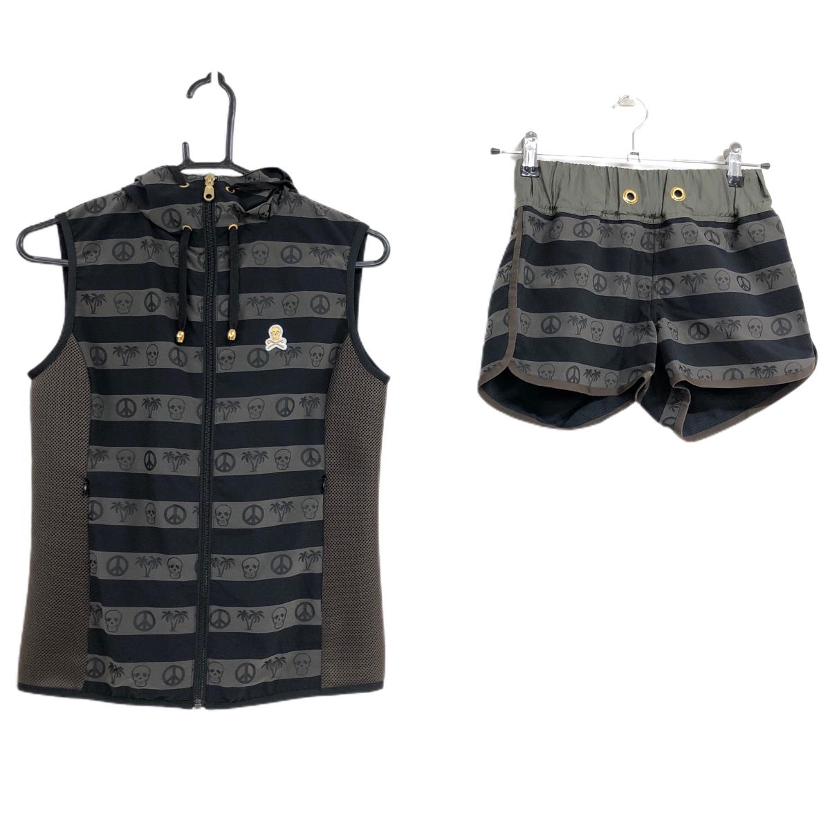 【美品】マークアンドロナ セットアップ 黒×ダークブラウン×カーキ 上下セット レディース S ゴルフウェア MARK&LONA