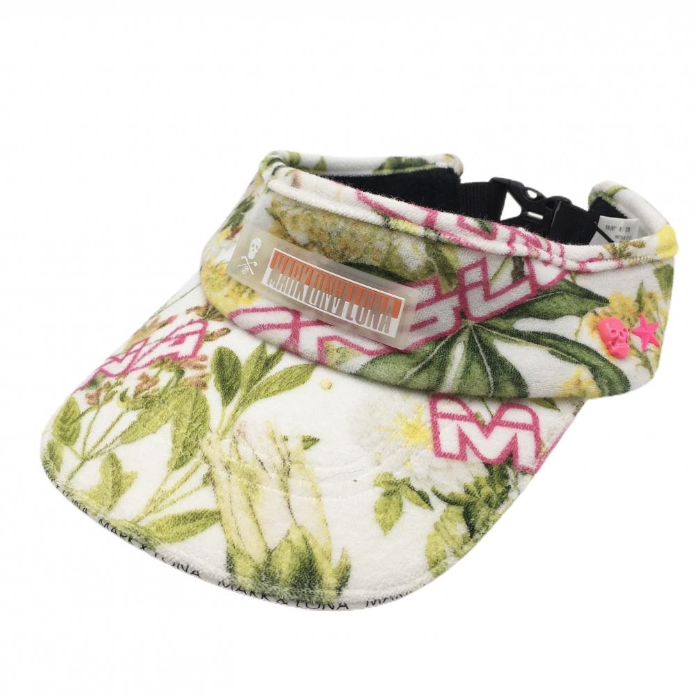 【美品】マークアンドロナ サンバイザー 黒×グリーン リーフ柄 立体ロゴ S ゴルフウェア MARK&LONA