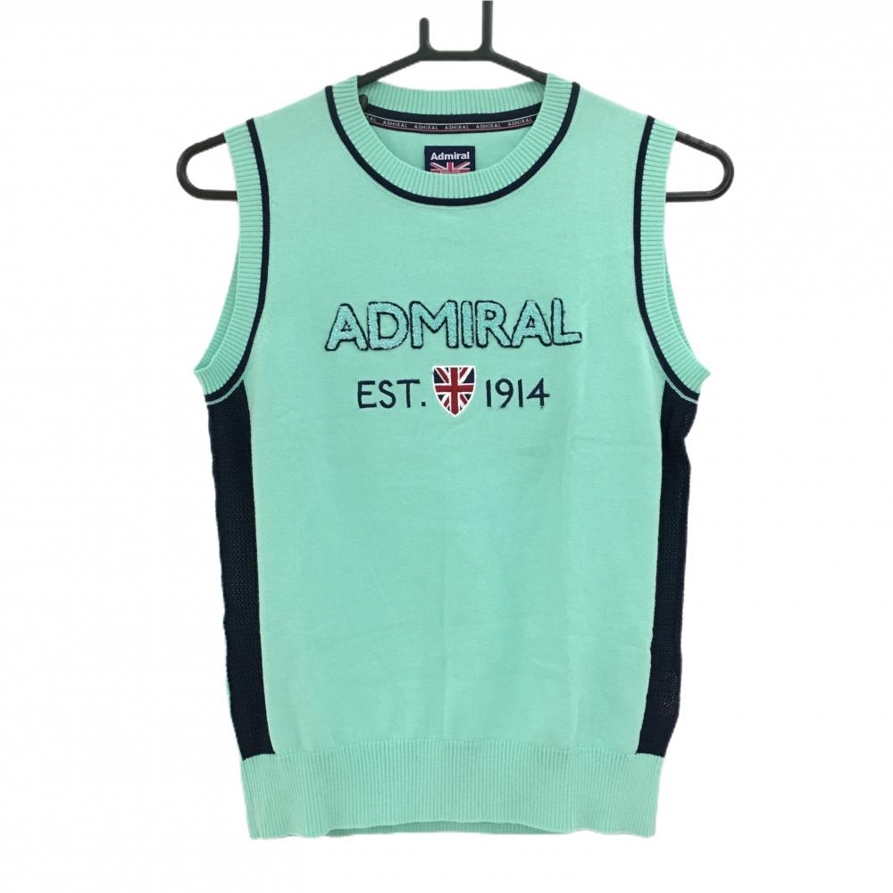 【美品】アドミラル ニットベスト ミントグリーン×ネイビー サイド透かし編み パイル地ロゴ レディース M ゴルフウェア Admiral