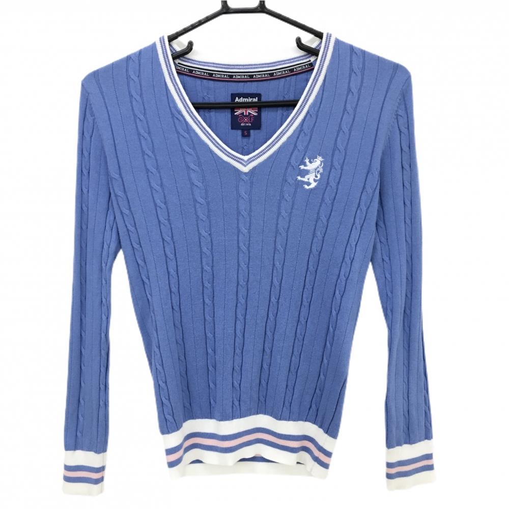 【美品】アドミラル セーター ライトブルー×白 チェック Vネック ロゴ刺しゅう ニット レディース M ゴルフウェア Admiral