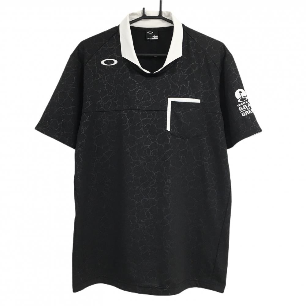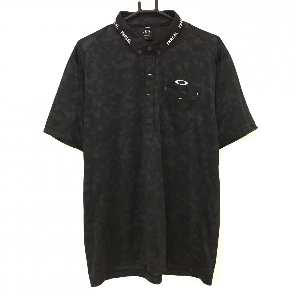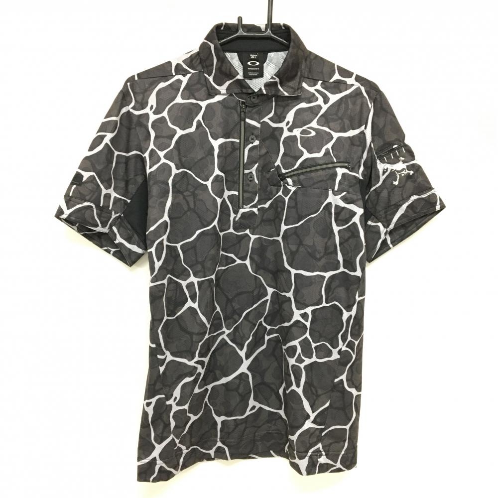 【超美品】オークリー 半袖ポロシャツ ダークグレー×黒 総柄地模様 袖下メッシュ調 ロゴ刺しゅう メンズ M ゴルフウェア Oakley