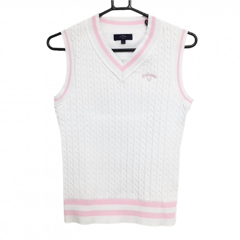【新品】キャロウェイ ニットベスト 白×ピンク ケーブル編み 撥水 レディース L ゴルフウェア Callaway