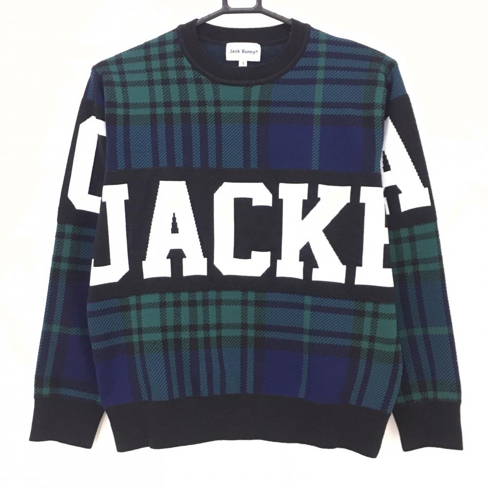 【超美品】ジャックバニー セーター 黒×グリーン×白 チェック ビッグロゴ ニット レディース 1(M) ゴルフウェア 2024年モデル Jack Bunny