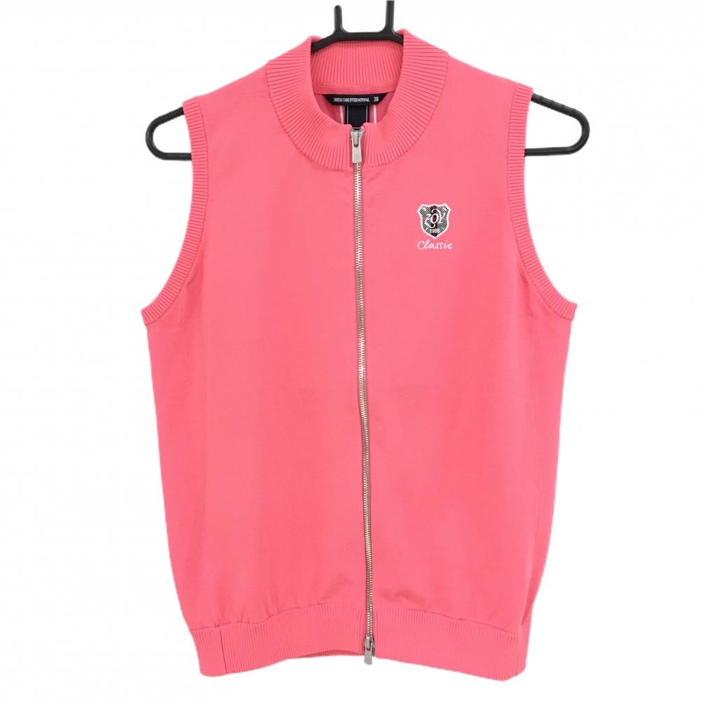 【超美品】ゾーイ ニットハイネックベスト ピンク系×白 ハーフジップ 胸ロゴ ウール100% レディース L ゴルフウェア ZOY