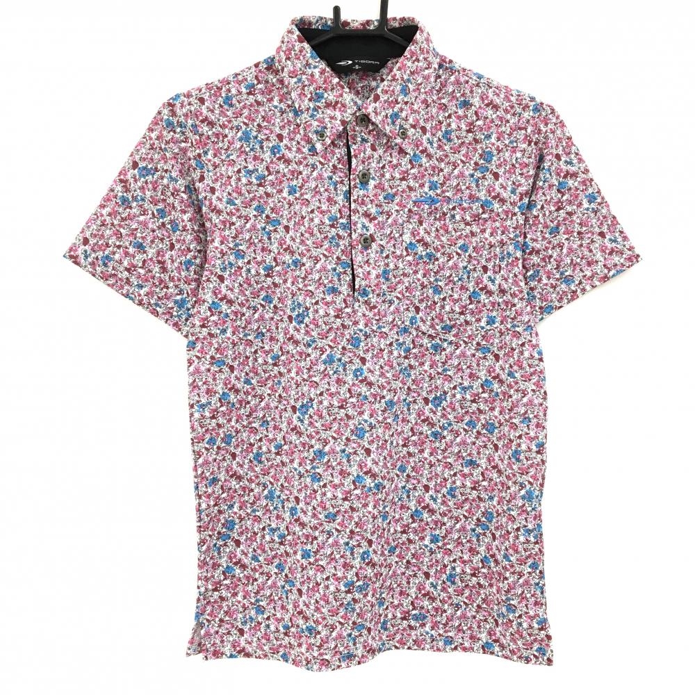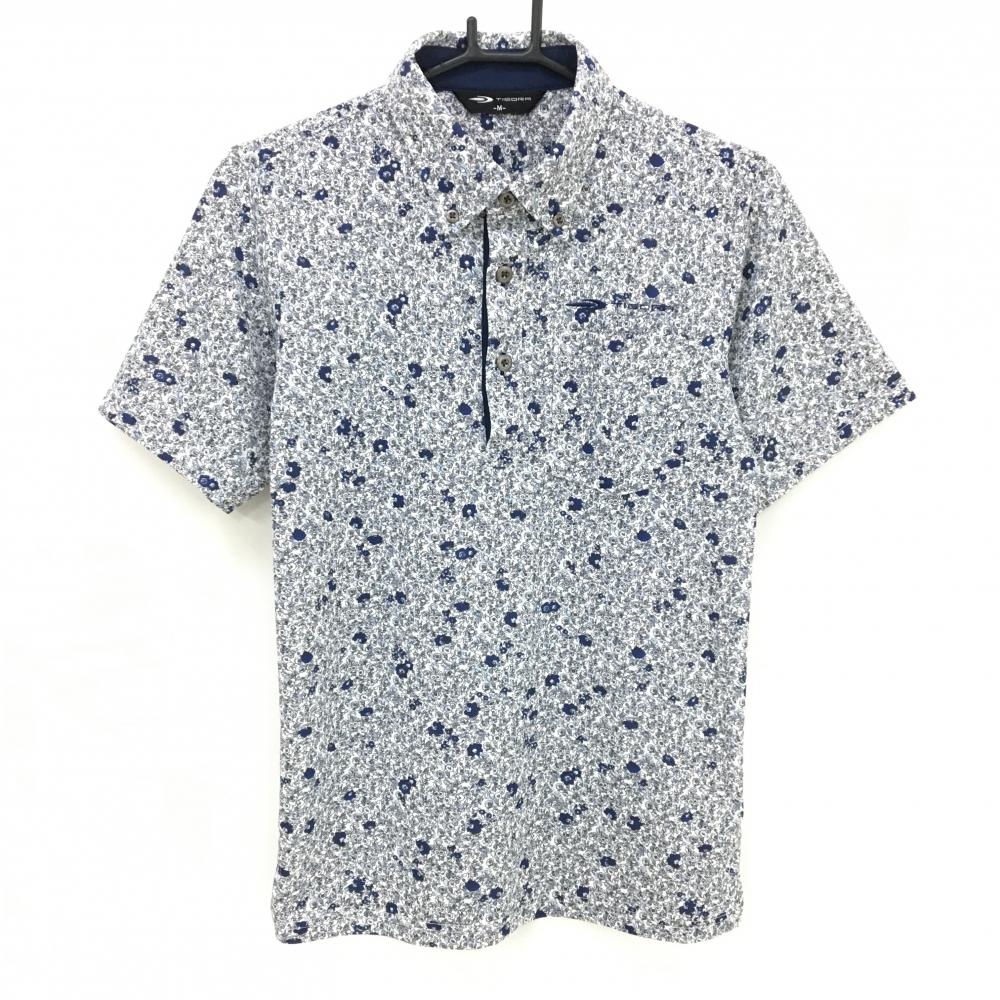 【超美品】ティゴラ 半袖ポロシャツ 白×黒×ネイビー 小花柄 ボタンダウン 胸ポケット付 メンズ M ゴルフウェア TIGORA