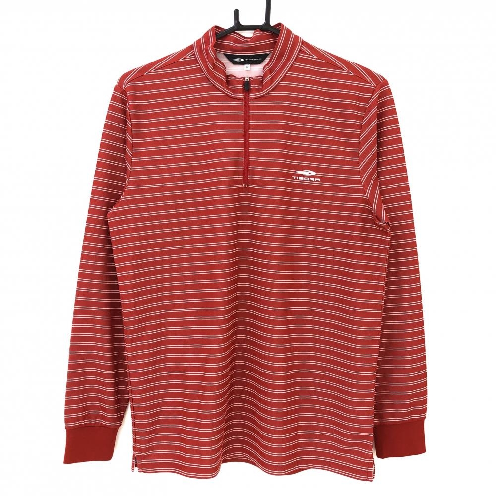 【超美品】ティゴラ 長袖ハイネックシャツ レッド×白 ボーダー ハーフジップ メンズ M ゴルフウェア TIGORA