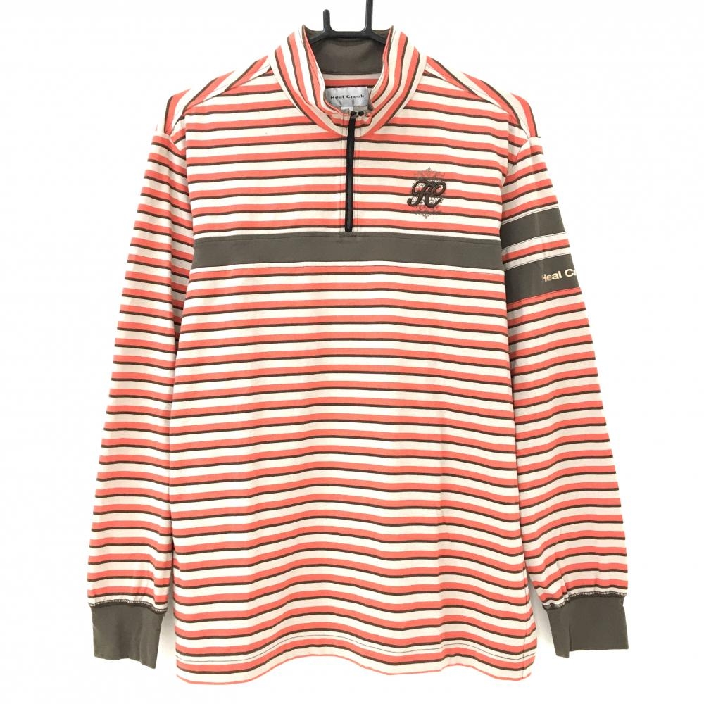 ヒールクリーク 長袖ハイネックシャツ ベージュ×レッド ボーダー ハーフジップ メンズ 50(L) ゴルフウェア Heal Creek