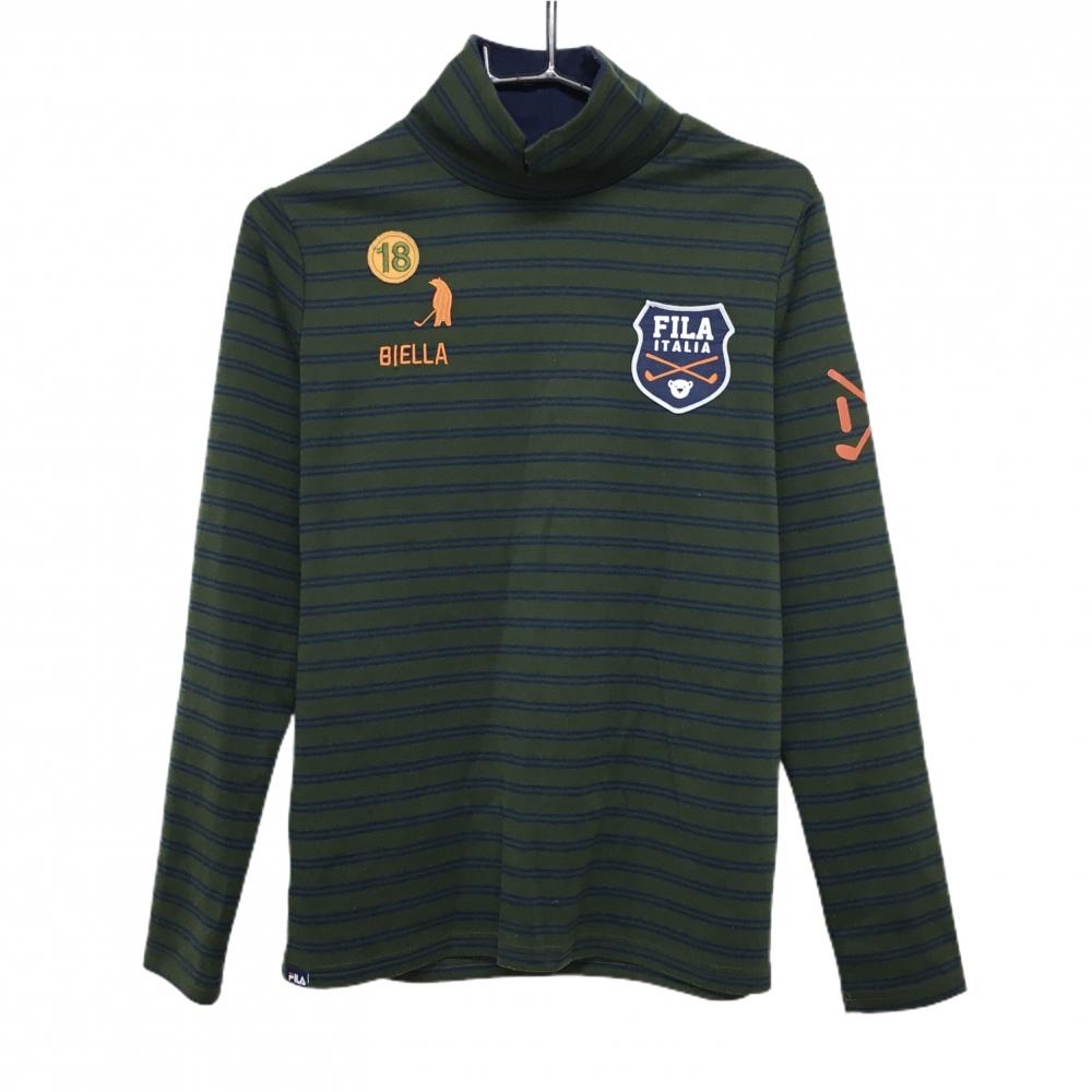 【美品】フィラゴルフ 長袖タートルネックシャツ ネイビー×グレー 細ボーダー ストレッチ レディース M ゴルフウェア FILA GOLF