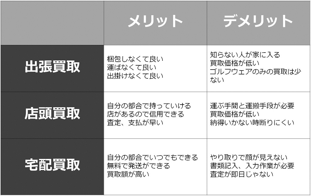 ゴルフウェアの「出張買取、店頭買取、宅配買取」メリット・デメリット