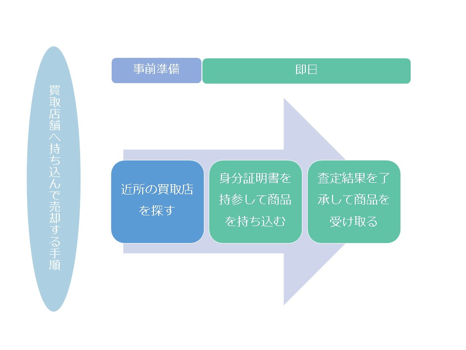 店頭買取店の場合は、持ち込める店舗を探して商品を持ち込み、身分証明書を提示して、その場で申込書に個人情報を記入して買取依頼をします。