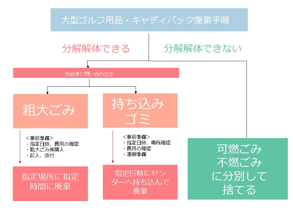 今回は、大型ゴルフ用品の中でも基本的にキャディバックを想定して作成していますが、他の大きなバックや練習器具なども応用して処分方法選択の判断ができます。