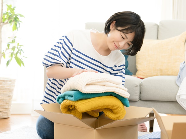 ダンボールに荷物を詰める女性